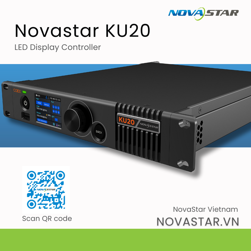 NovaStar KU20 là bộ điều khiển màn hình LED thuộc dòng COEX, trang bị 1× HDMI IN (kèm LOOP), 6× cổng Ethernet RJ45 và 1× cổng quang 10G (OPT). Hỗ trợ tải tối đa 3.9 triệu điểm ảnh, hoạt động ở chế độ All-In-One hoặc Send-Only, với low latency 0 frame, Frame Rate Adaptive 23.98–120 Hz, và quản lý tập trung qua phần mềm VMP.