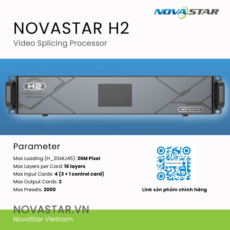 NovaStar H2 là bộ xử lý video wall splicer thế hệ mới, được thiết kế chuyên biệt cho các màn hình LED fine-pitch và các ứng dụng trình chiếu cao cấp. Kế thừa tinh hoa công nghệ của NovaStar, H2 mang đến hiệu suất xử lý vượt trội, khả năng ghép hình linh hoạt và tính năng vận hành mạnh mẽ, phù hợp với mọi nhu cầu từ phòng điều hành, trung tâm giám sát, sân khấu sự kiện cho tới studio XR.