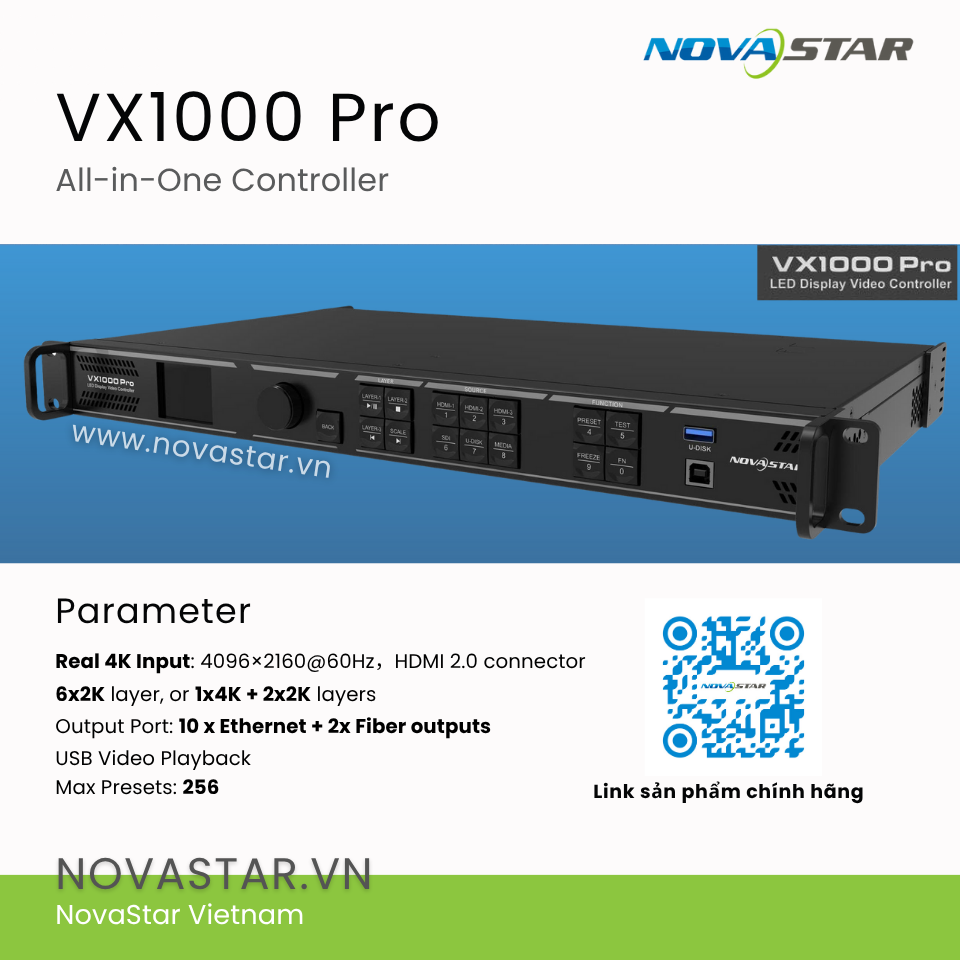 VX1000 Pro là bộ xử lý hình ảnh LED tích hợp cao cấp của NovaStar, thuộc dòng sản phẩm VX Pro. Thiết bị kết hợp đầy đủ chức năng của bộ xử lý video và bộ điều khiển màn hình LED trong cùng một thiết bị duy nhất, hỗ trợ tải lên đến 6.5 triệu điểm ảnh, phù hợp với các màn hình LED độ phân giải lớn, sân khấu chuyên nghiệp, studio truyền hình và các hệ thống hiển thị trung tâm.